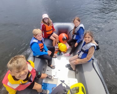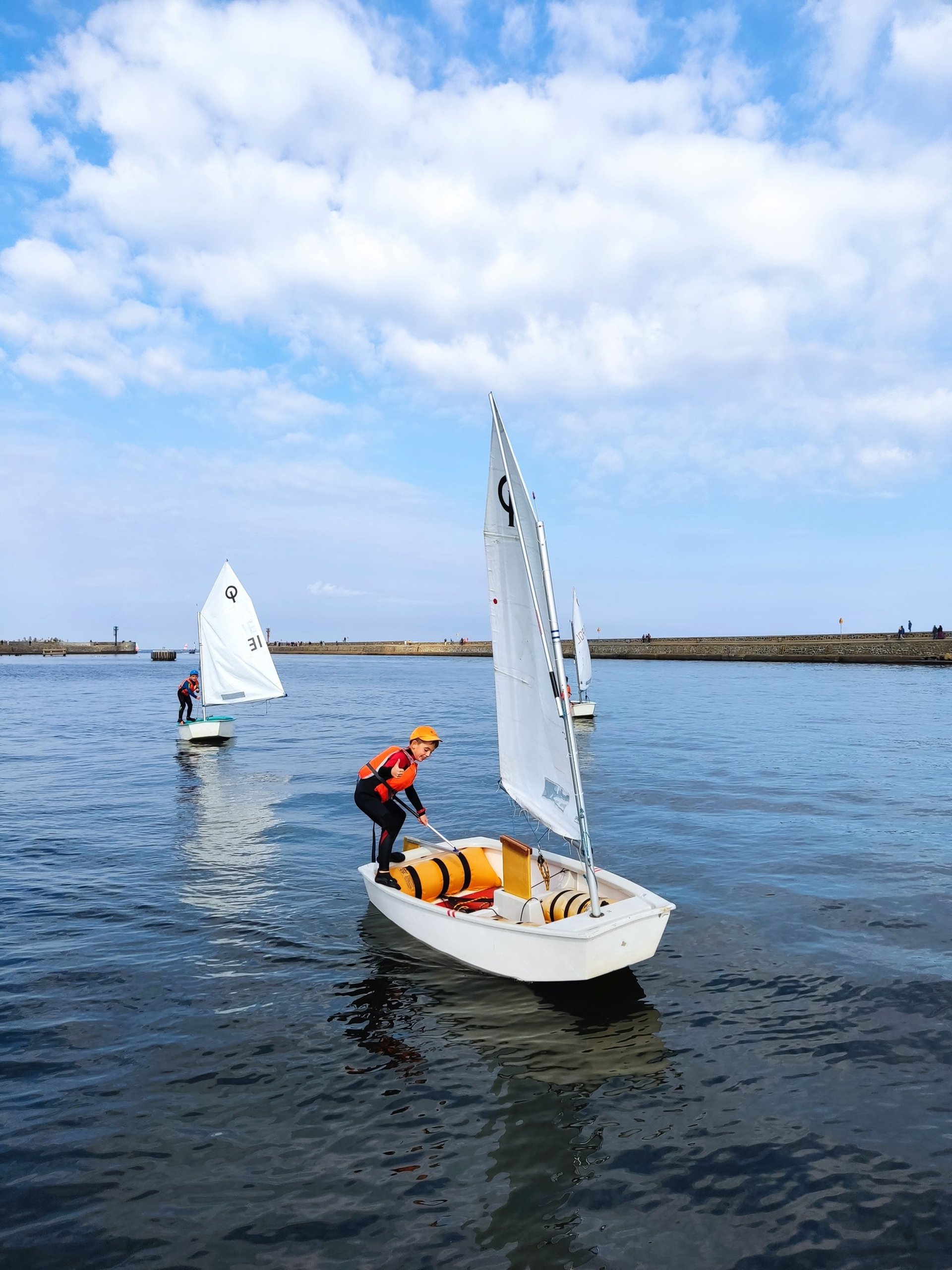 Uczymy żeglować na symulatorze żeglarskim, a na wodzie dzieciaki żeglują na łodziach typu Optimist. Korzystamy też z desek SUP. Zabezpieczamy zajęcia na wodzie motorówką typu RIB, na której zajęcia prowadzi instruktor.